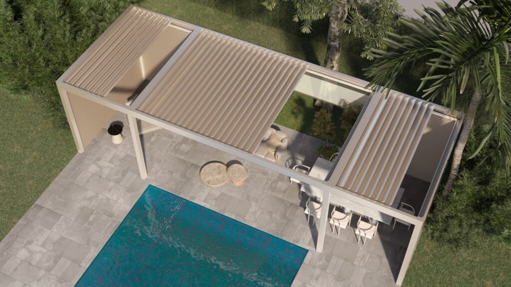 Bioclimatic Louvered — Motorised 0-135° rotation, rain sensors, LED lighting.